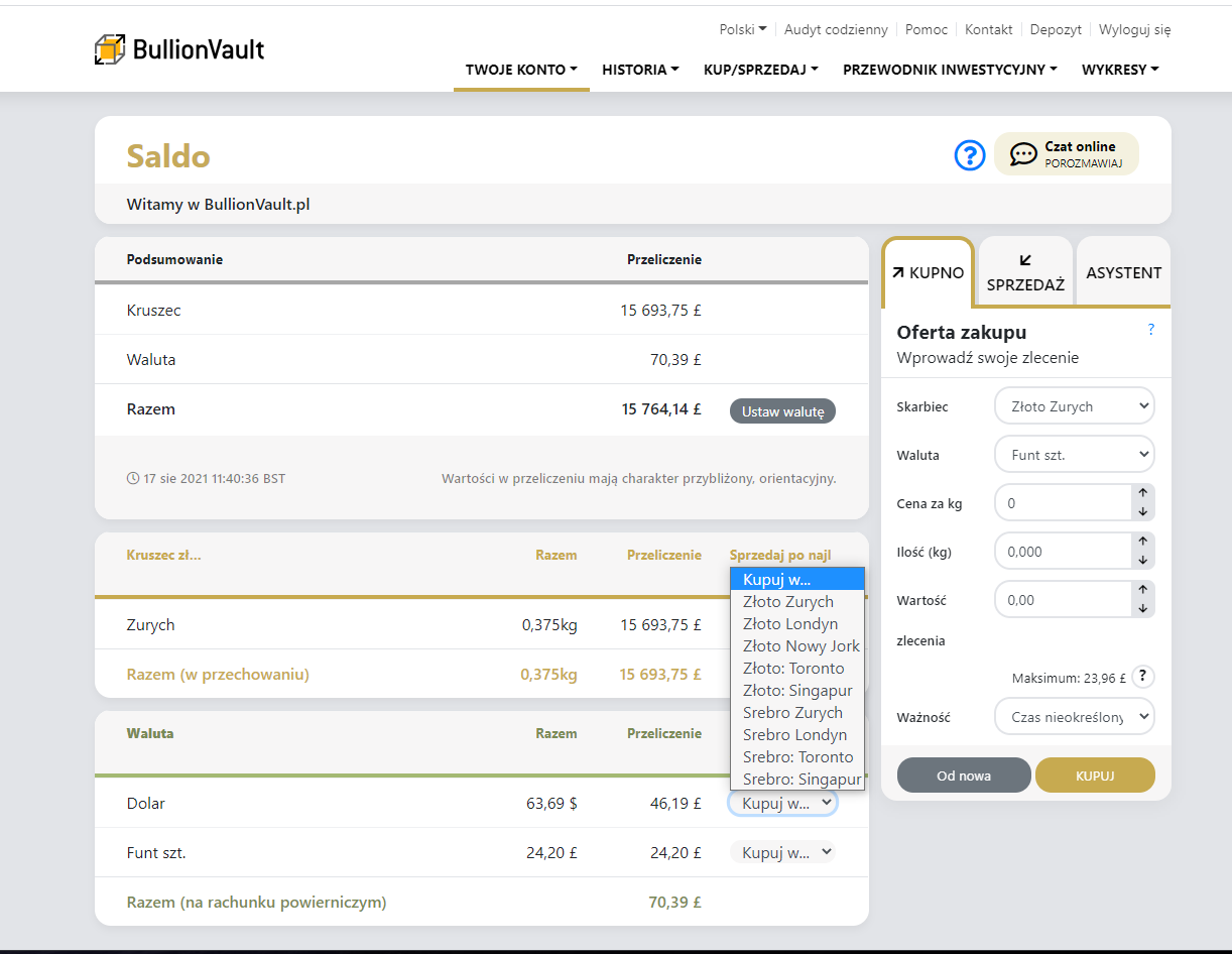Pamiętaj, aby następnie sprawdzić Saldo swojego konta i ponownie upewnić się czy ilość dostępnych środków na koncie się zgadza. Kiedy zlecenie zakupu zostanie zrealizowane, część srodków powinna nadal być dostepna na Twoim koncie. Możesz ją przeznaczyć na pokrycie opłat za przechowanie kruszcu. Zapoznaj się ze szczegółowymi informacjami na temat opłat.
